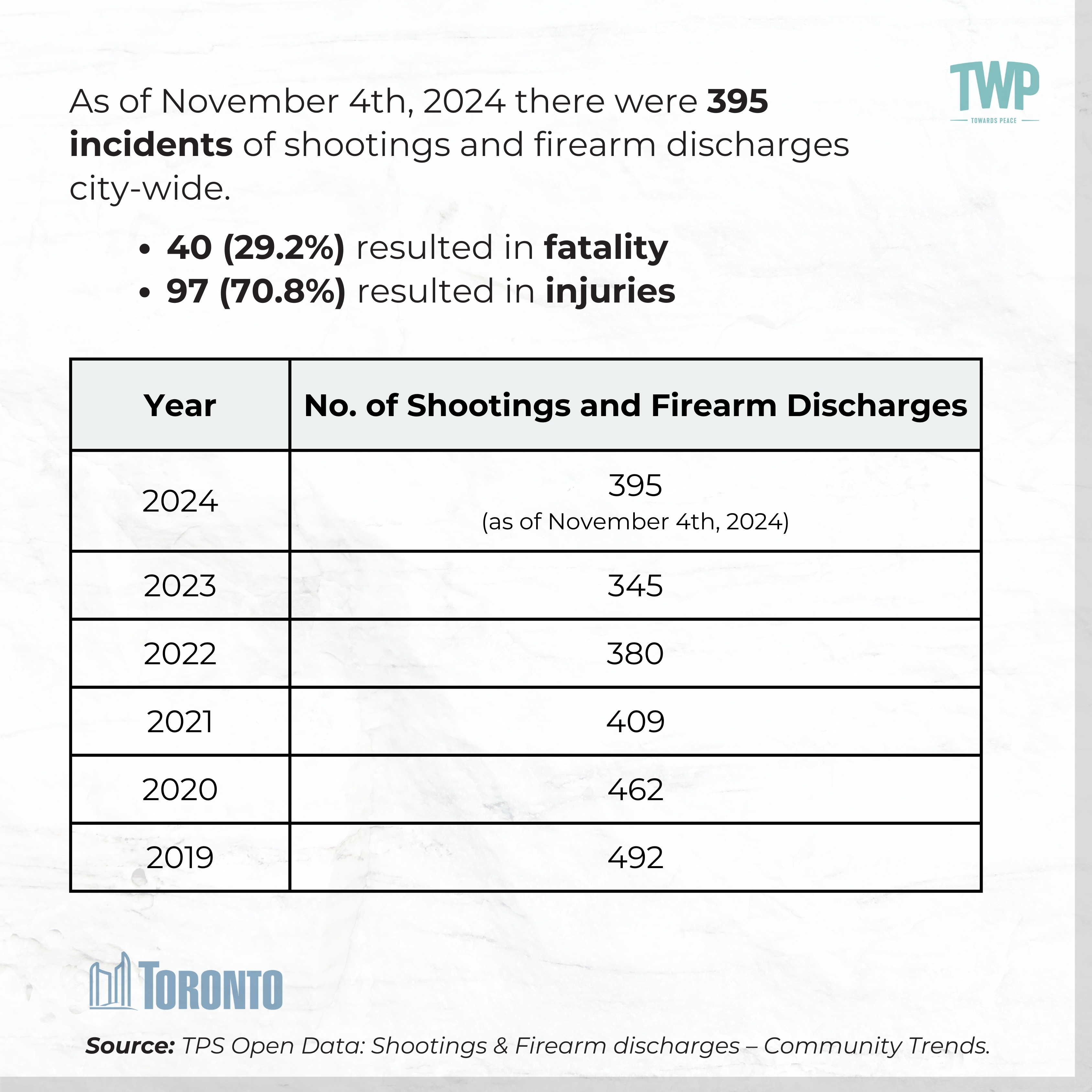 As of November 4, 2024, our city has seen 395 incidents of shootings and firearm discharges in 2024. 18 occurred in the TWP Scarborough catchment area (Malvern East & West, Morningside, West Hill). 30 occurred in the TWP North West catchment area (Black Creek, Glenfield-Jane Heights, Rexdale-Kipling)
